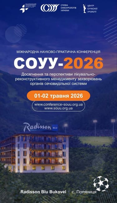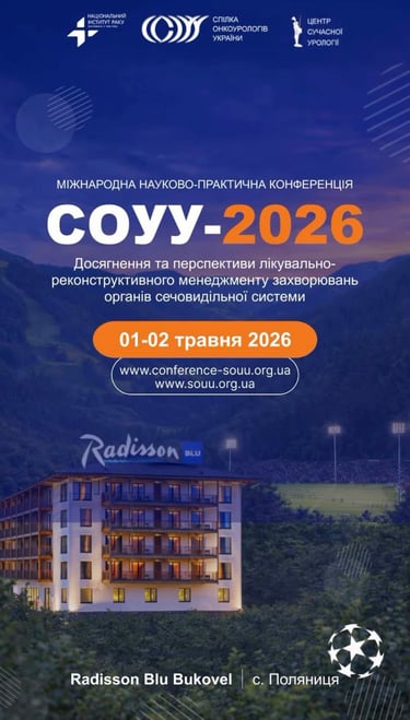 1-2 травня 2026 р. відбудеться міжнародна науково-практична конференція «СОУУ-2026. Досягнення та перспективи в лікувально-реконструктивного менеджменту захворювань органів сечовидільної системи», Radisson Blu Bukovel, с. Поляниця.